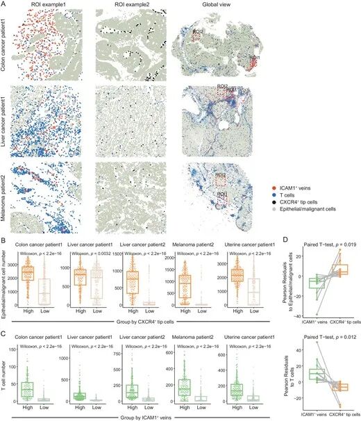 图3:CXCR4+ 尖端细胞分布于肿瘤核心并与上皮/恶性细胞共定位,ICAM1+ 静脉靠近T细胞分布;