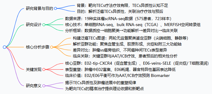 本研究整合19种实体瘤的单细胞RNA测序数据,构建泛癌内皮细胞图谱,解析肿瘤内皮细胞(TECs)的组成与功能异质性,明确其在肿瘤与非肿瘤组织中的表型差异,探究其与抗血管生成治疗(AAT)和免疫检查点阻断(ICB)疗效的关联,为靶向TECs的治疗策略提供依据。
