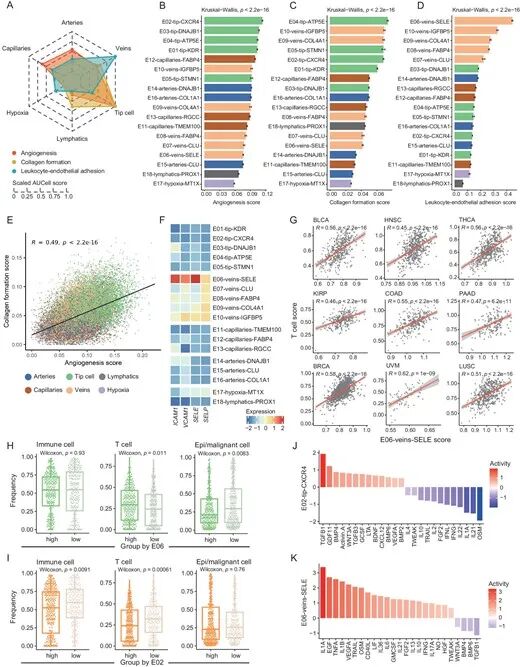 图2:揭示内皮细胞亚群的表型异质性, angiogenesis、胶原形成及白细胞-内皮粘附功能存在差异,E02-tip-CXCR4 与血管生成相关,E06-veins-SELE 与炎症及T细胞浸润相关;