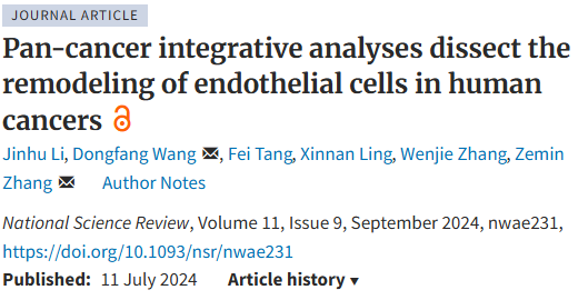 2024年7月12日,北京大学李金虎、王东芳、张泽民团队在《National Science Review》发表研究,揭示了人类癌症中内皮细胞的重塑特征及与癌症治疗的关联。今天我们就来拆解一下这篇文章:Pan-cancer integrative analyses dissect the remodeling of endothelial cells in human cancers。