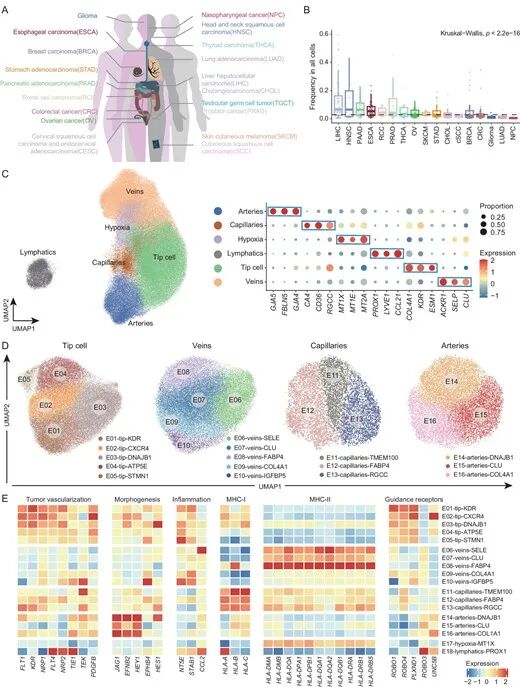 图5:肿瘤组织中尖端细胞富集,动脉、毛细血管和淋巴管减少,内皮细胞在肿瘤进展中发生系统性重编程,部分基因表达呈现癌种保守性;