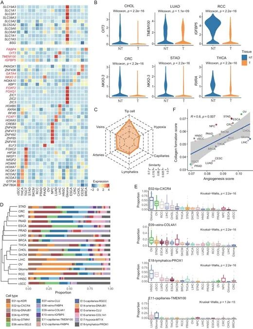 图4:不同癌种的TECs存在异质性,器官特异性基因表达部分保留,毛细血管亚群转录组差异最大, angiogenesis 与胶原形成评分呈正相关;