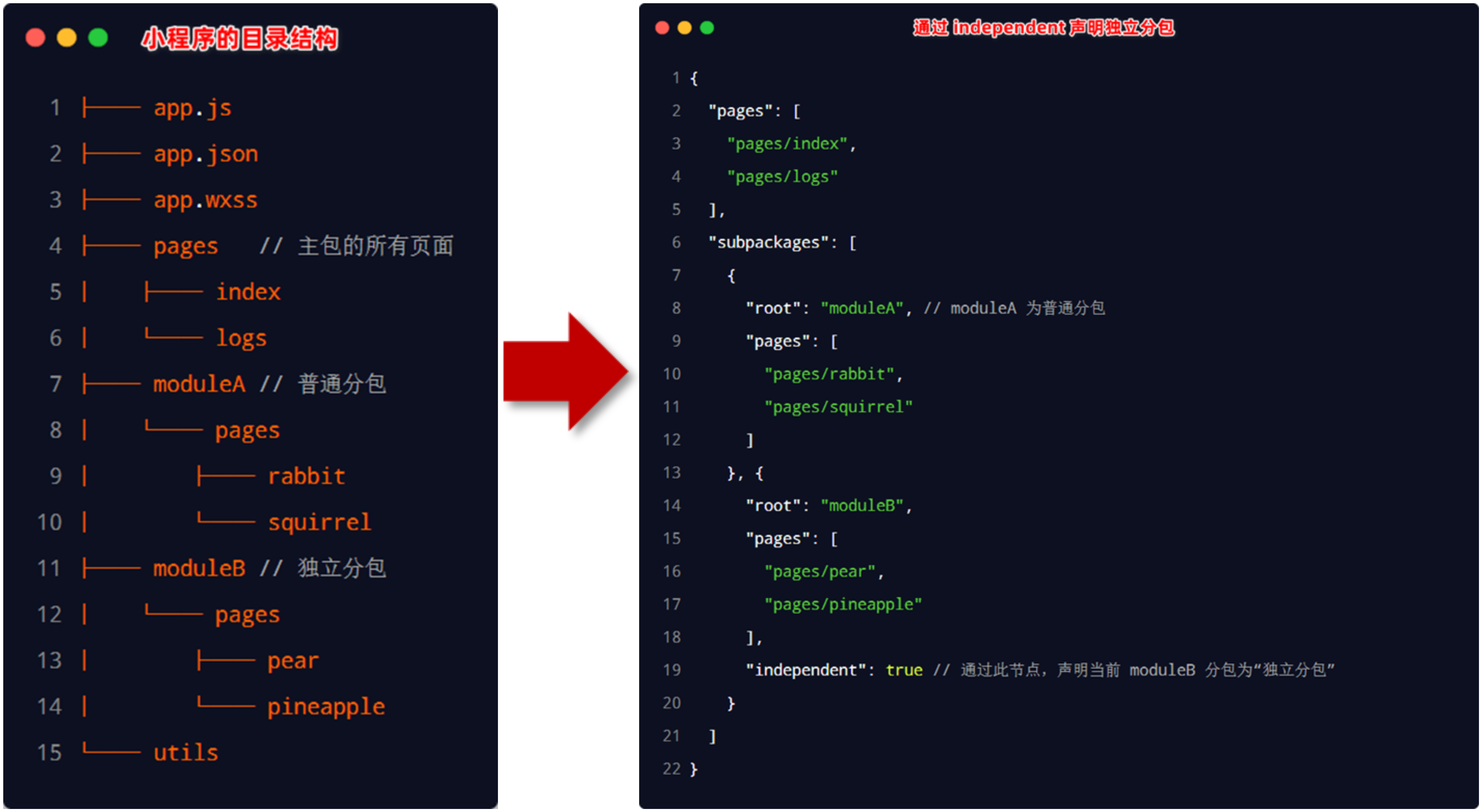 在 app.json 中通过 subpackages 节点声明分包结构,示例如下: