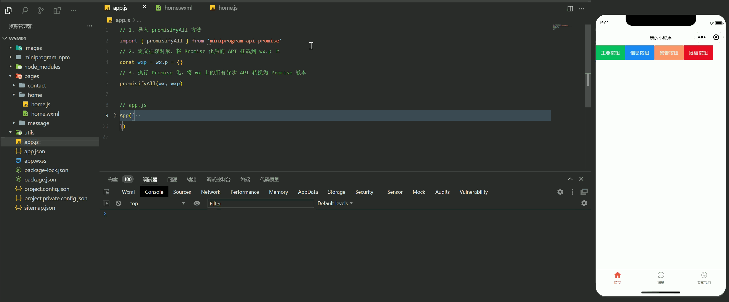 只需在 app.js 中调用一次 promisifyAll() 方法,即可完成所有异步 API 的 Promise 化: