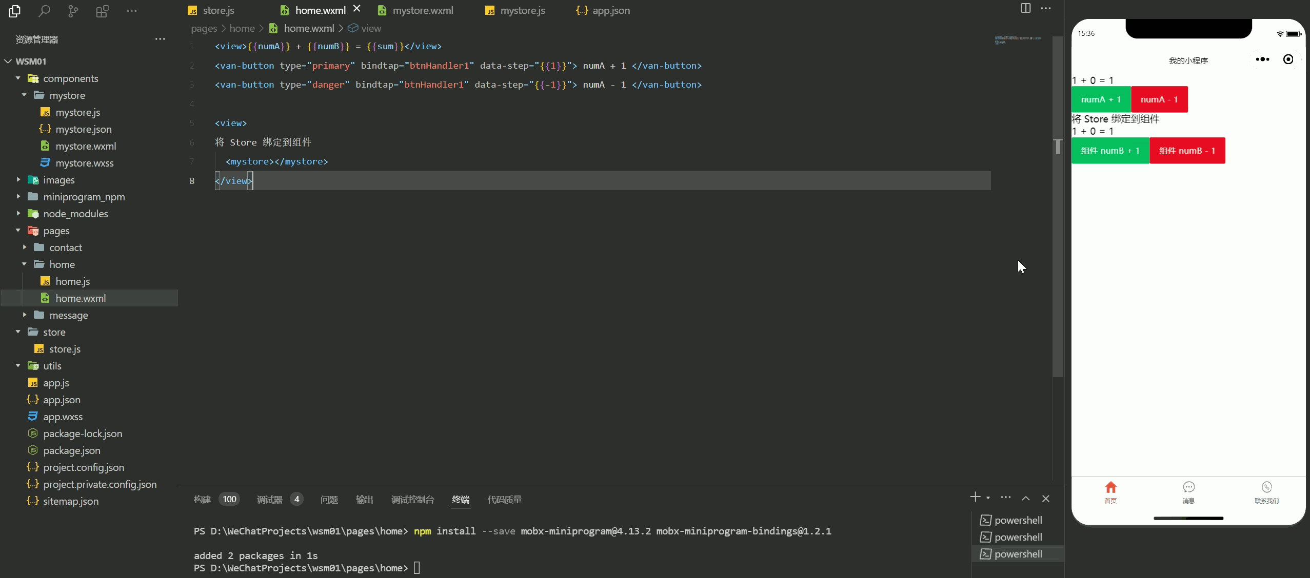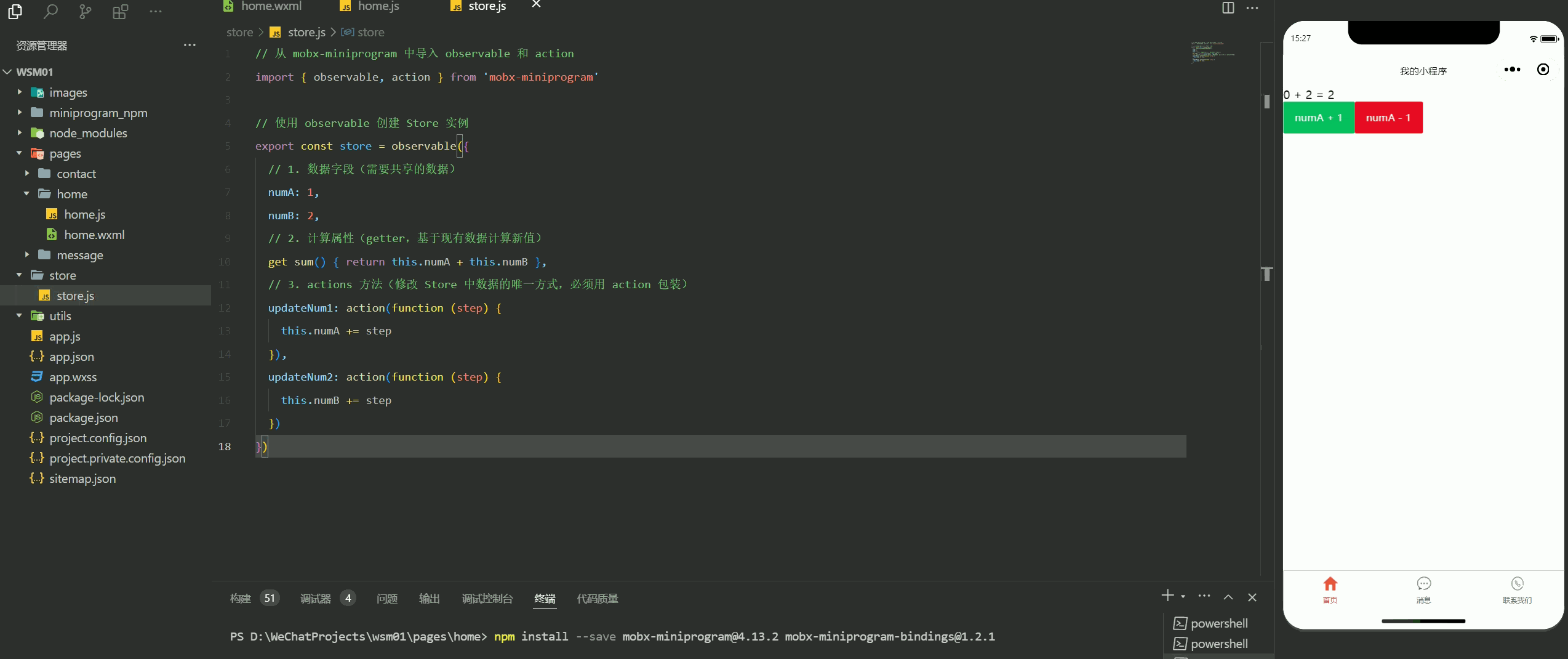安装依赖: 在项目根目录执行 npm 命令,安装指定版本的包:别忘记,小程序工具-构建npm
