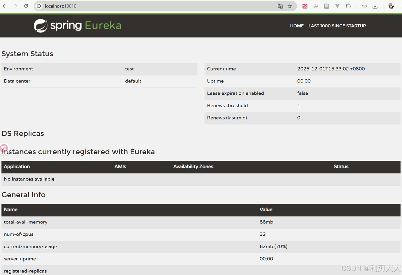 启动服务,访问注册中心:http://127.0.0.1:10010/,可以看到 eureka-server 已经启动成功了。