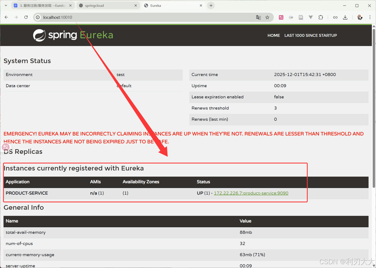 刷新注册中心:http://127.0.0.1:10010/,可以看到 product-service 已经注册到 eureka 上了: