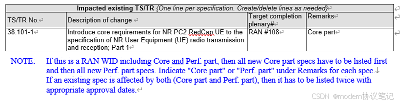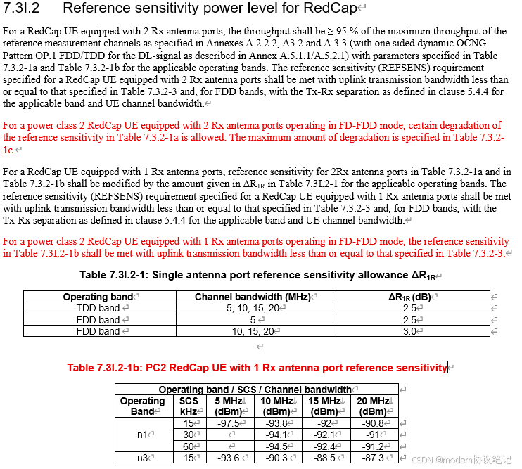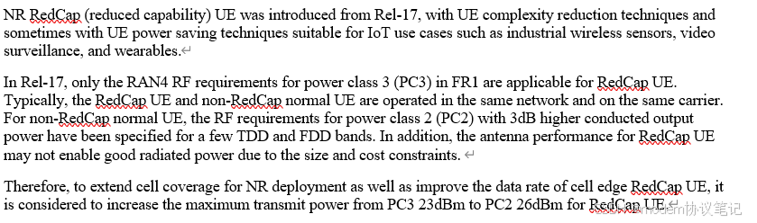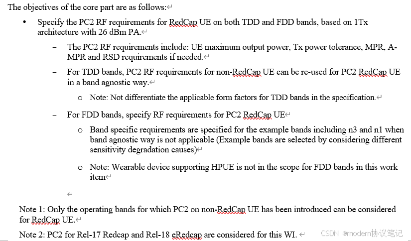 核心部分的目标是:基于采用 26 dBm 功率放大器的 1Tx 架构,规定 RedCap UE 在 TDD 和 FDD 频段的 PC2 射频要求,涵盖最大输出功率、发射功率容限等。其中,TDD 频段可复用非 RedCap UE 的 PC2 射频要求且不区分外形;FDD 频段需规定频段特定要求(如 n3、n1),支持 HPUE 的可穿戴设备不在 FDD 范围内。此外,仅非 RedCap UE 已引入 PC2 的频段可被 RedCap UE 考虑,且这个WI涵盖 R17 redcap 和 R18 eRedCap 的 PC2。