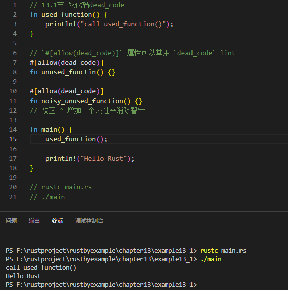 编译器提供了 dead_code(死代码,无效代码)lint,这会对未使用的函数产生警告。可以用一个属性来禁用这个 lint。