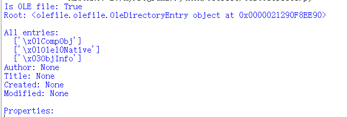 使用olefile库也能读取OLE文件中指定流的数据,但是遇到和C#调用OpenMcdf模块解析OLE文件类似的问题,想从\x01Ole10Native流中提取原始文件名称及数据,但不知道数据结构,还得继续查找资料。