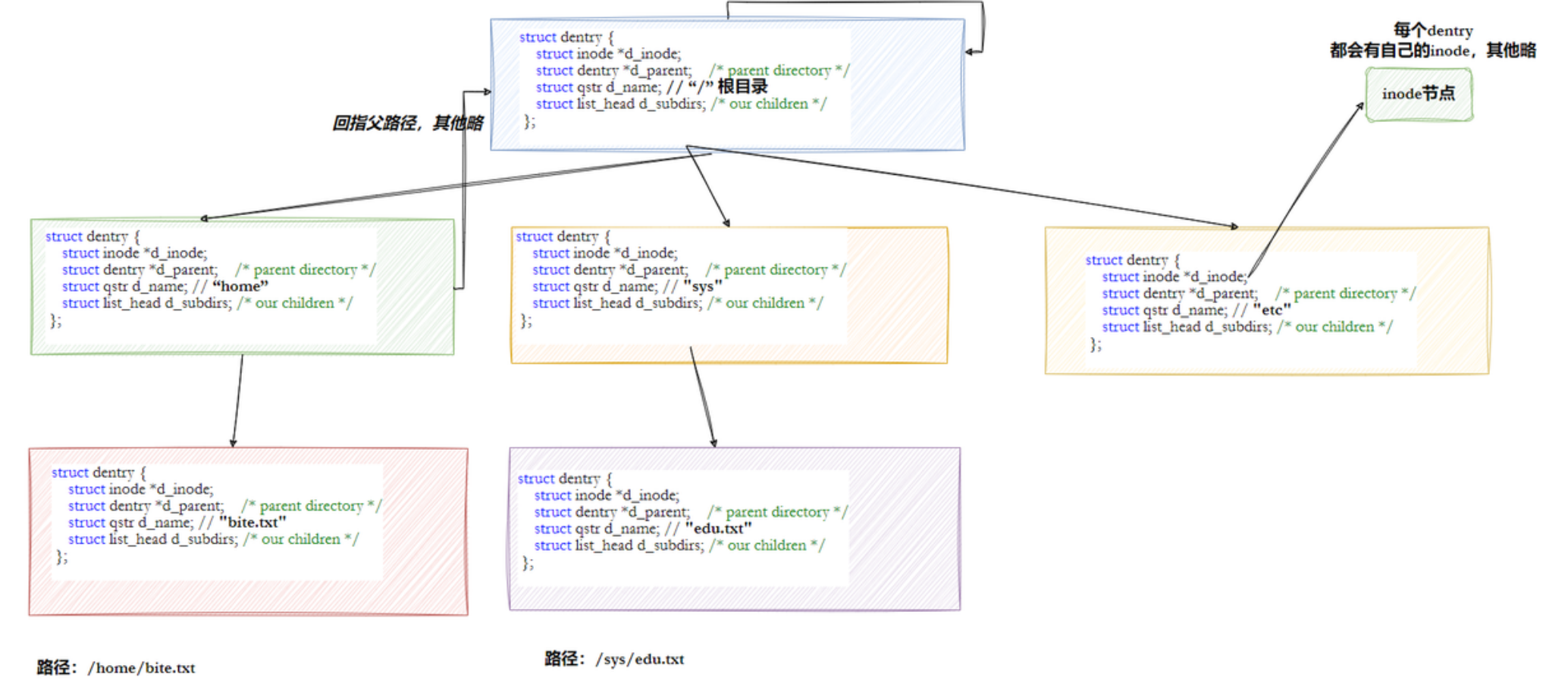 如果要进行一个文件操作,原则上必须从根目录开始依次向下找到文件,但这样太慢,所以Linux中有一个数据结构struct dentry 专门用来维护树状路径结构。