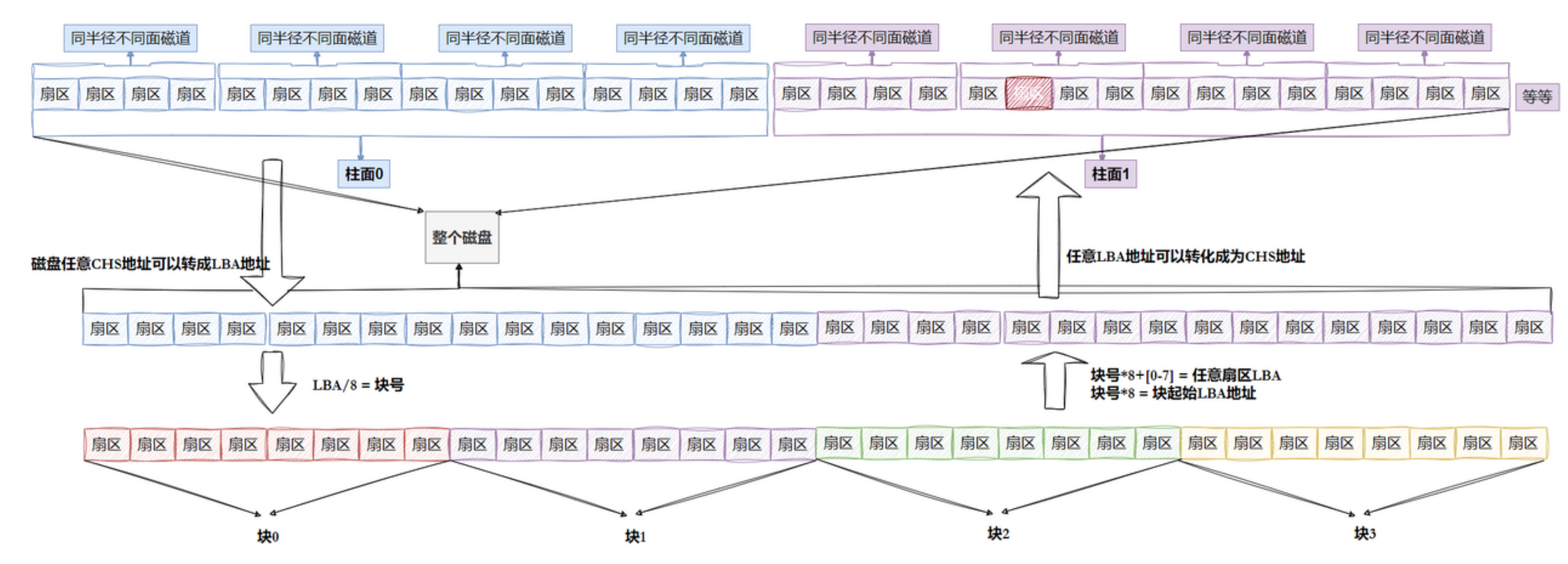 在Linux中,磁盘的存储容量会被视为对应容量的一维数组,下标从0开始。对于如何具体管理区分不同磁道、盘面、扇区则会由一套算法进行CHS地址和LBA地址之间的转化: