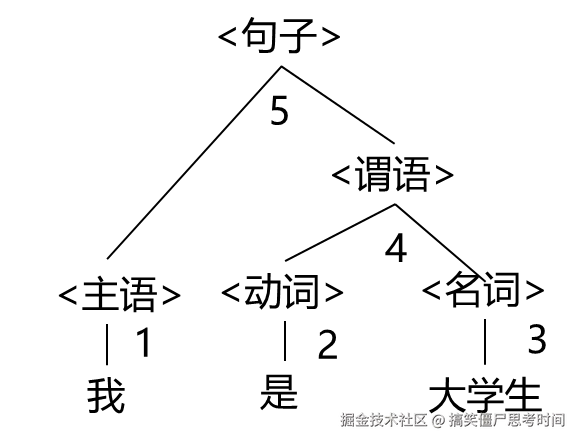 我|是大学生 →<主语>是|大学生 →<主语><动词>大学生| →<主语><动词><名词>| → <主语><谓语>| → <句子>|