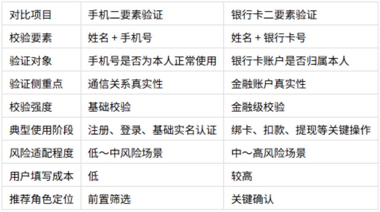 从用户体验和合规成本来看,手机二要素所需信息更少,操作阻力低,适合高频、低门槛的业务场景;银行卡二要素需要用户提供银行卡号,数据敏感度更高,对平台在合规、数据安全和风控能力上的要求也明显更高,因此一般只会放在关键节点使用。