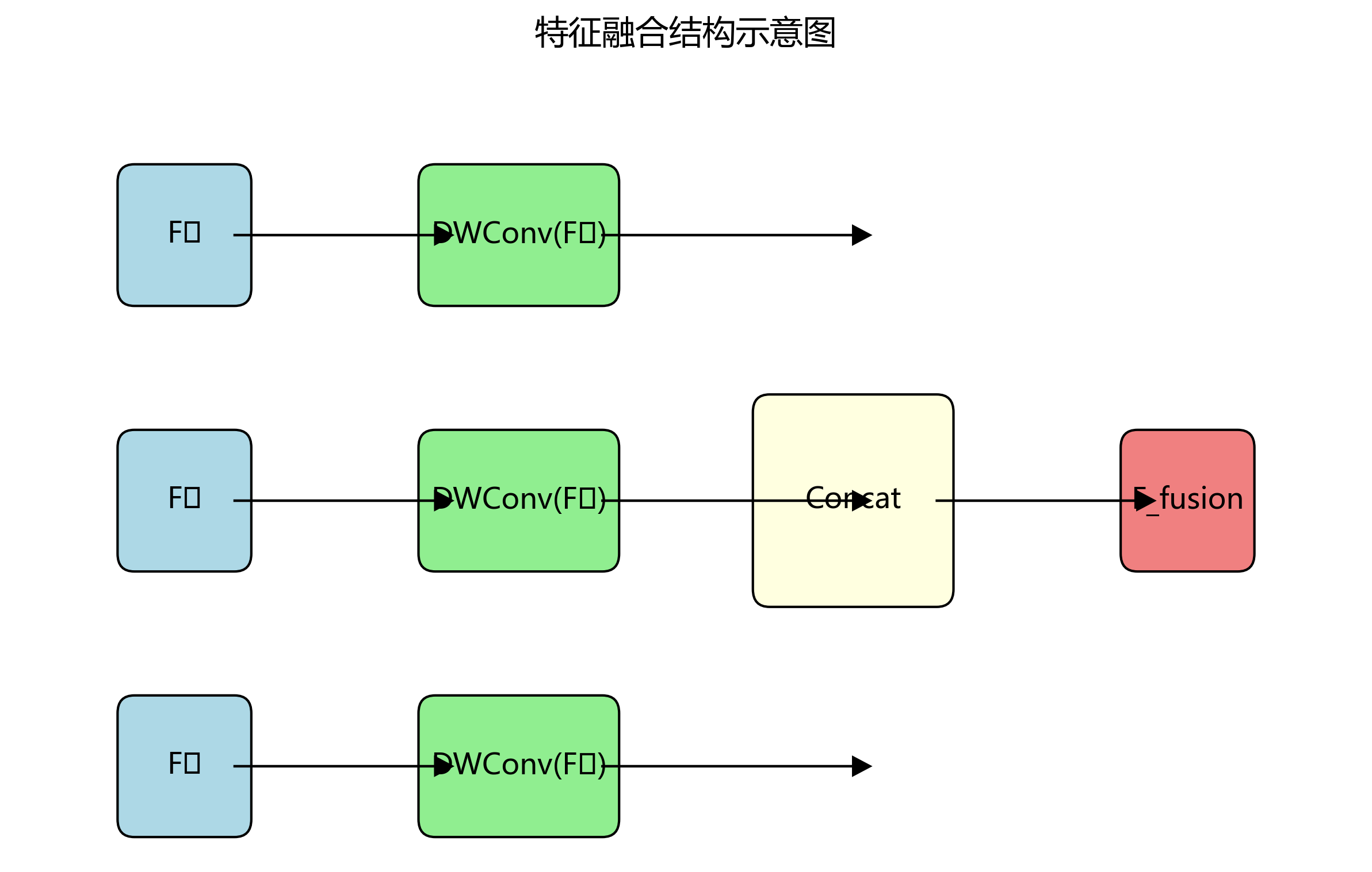F f u s i o n = Concat ( DWConv ( F 1 ) , DWConv ( F 2 ) , DWConv ( F 3 ) ) F_{fusion} = \text{Concat}(\text{DWConv}(F_1), \text{DWConv}(F_2), \text{DWConv}(F_3)) Ffusion=Concat(DWConv(F1),DWConv(F2),DWConv(F3))