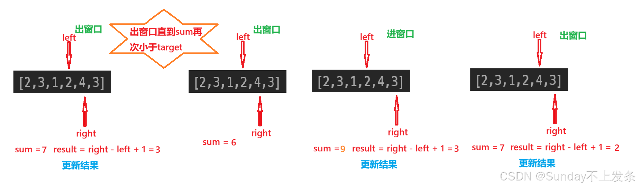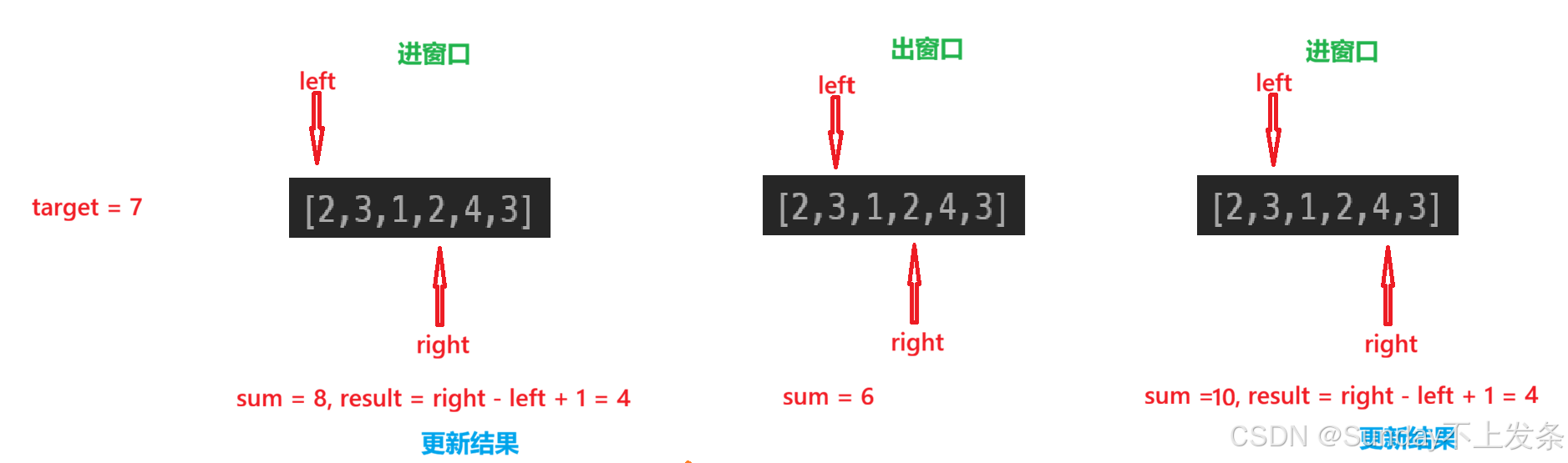 (2)right 指针向右移动,进窗口,并求和 sum;当和 大于或等于target 时,更新结果;
