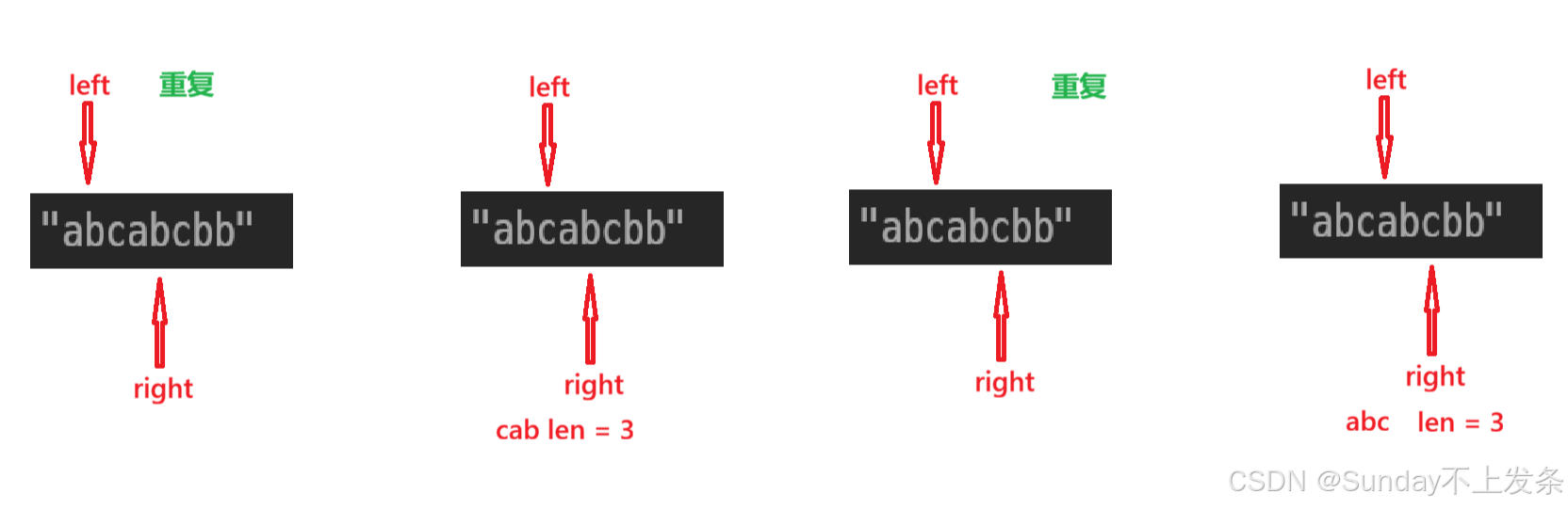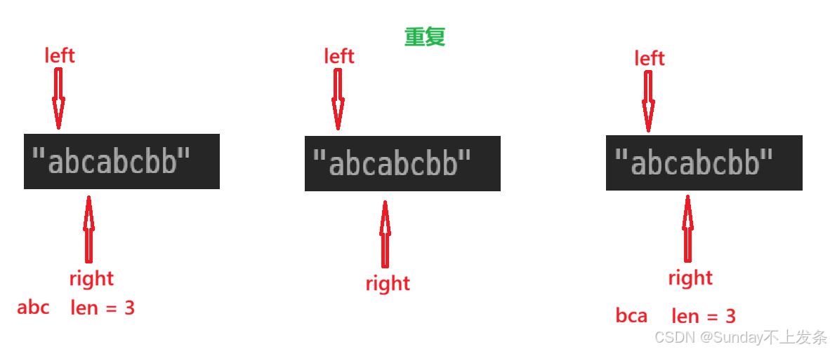 (3)出现重复字符,left 指针向右移动,直到找到重复字符,然后继续让 right++;