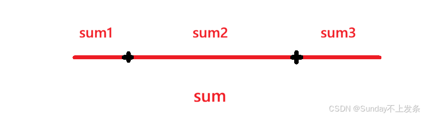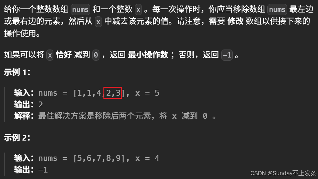 假设从左边和右边找到了几个连续的元素,求和为x,则此时x可以被减到0。设数组所有元素之和为sum,又有sum1 + sum3 = x,则sum2 = sum - x。