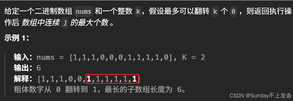 - 如果等于0,则cnt++:如果cnt <= k,说明窗口合法,right++,并更新结果;如果cnt > k,则要多余的0出窗口,即让left++,直到找到0,让cnt--,使得cnt == k。