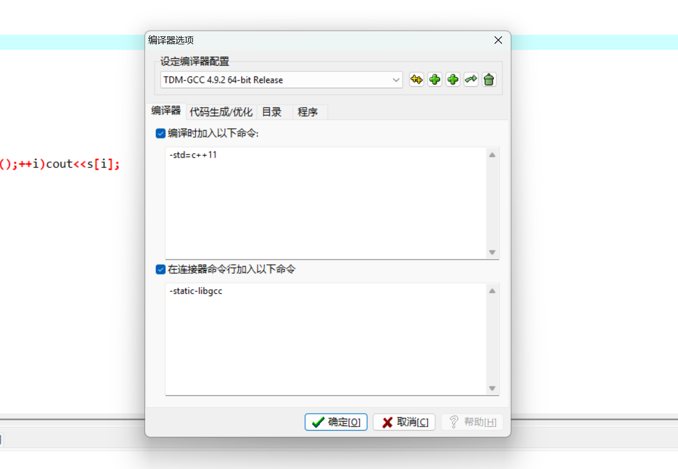 第二步:勾选编译时加入以下命令,并填写-std=c++11,点击✔确定