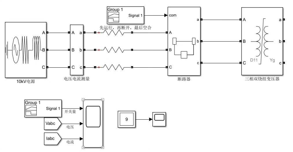先看这个核心模型(图1)。建模的关键在于把铁芯的非线性特性塞进仿真里。传统线性模型根本抓不住涌流的精髓,必须上磁化曲线的饱和特性。在Simulink里直接调用Saturable Transformer模块,设置磁化曲线参数时要注意转折点的斜率------这个值直接决定了铁芯啥时候开始摆烂(饱和)。