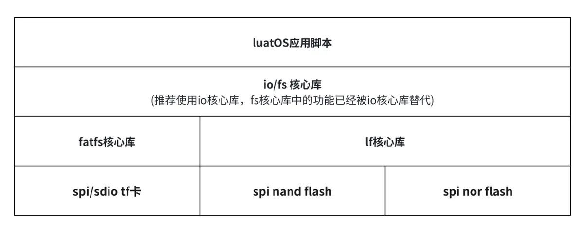 LuatOS的存储系统采用清晰的分层架构设计,其核心目标是为应用层提供统一、简洁的文件操作接口,从而屏蔽底层不同存储介质和文件系统的差异。开发者无需关心数据具体存储在何种硬件上,也无需关心底层文件系统的具体实现,只需调用统一的API即可完成文件操作。