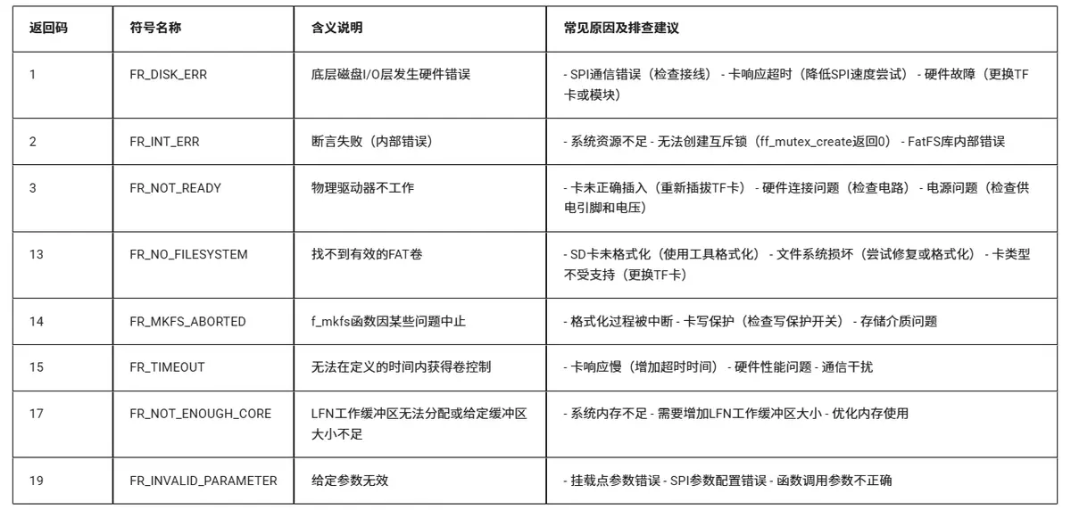 1、挂载前需确保SPI接口已正确初始化,SDIO模式不需要初始化; 2、若挂载失败,可以尝试打开调试信息查找原因;