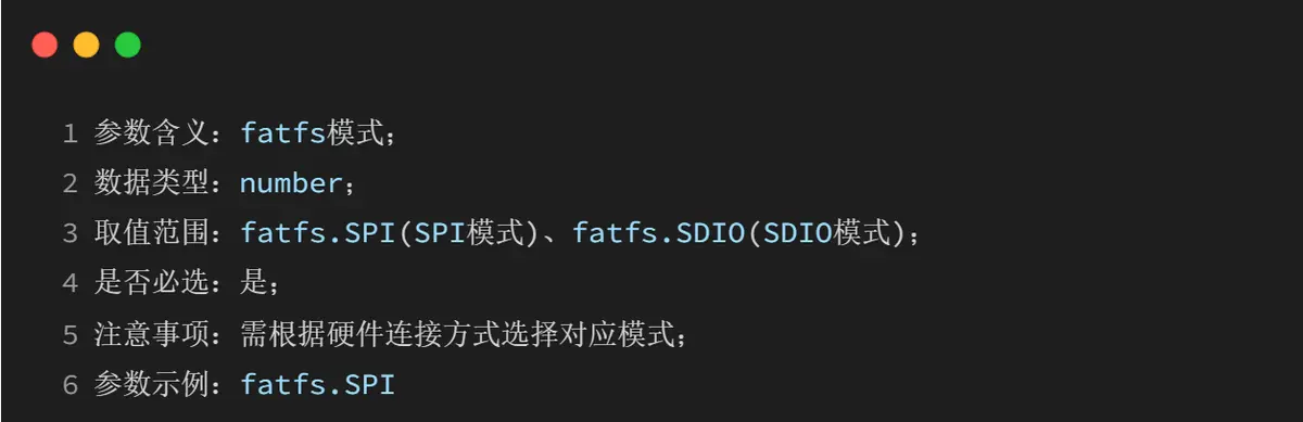 4.1 fatfs.mount(mode, mount_point, spiid_or_spidevice, spi_cs, spi_speed, power_pin, power_on_delay, auto_format)