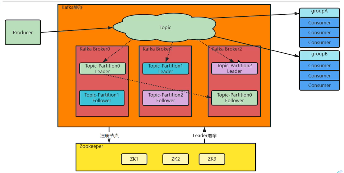 另一方面:服务不稳定,数据容易丢失。 单机服务下,如果服务崩溃,数据就丢失了。为了保证数据安全,就需要给每个Pariion配置一个或多个备份,保证数据不丢失。Kafka的集群模式下,每个Pariion都有一个或多个备份。Kaka会通过一个统一的zookeeper集群作为选举中心 ,给每个Paniion选举出一个主节点Leader,其他节点就是从节点Folower。主节点负责响应客户端的具体业务请求,并保存消息。而从节点则负责同步主节点的数据。当主节点发生故障时,Kafka会选举出一个从节点成为新的主节点。 最后:Kafka集群中的这些Broker信息,包括Partiton的选举信息,都会保存在额外部署的Zookeper集群当中,这样,kaka集群就不会因为某一些Broker服务崩溃而中断。