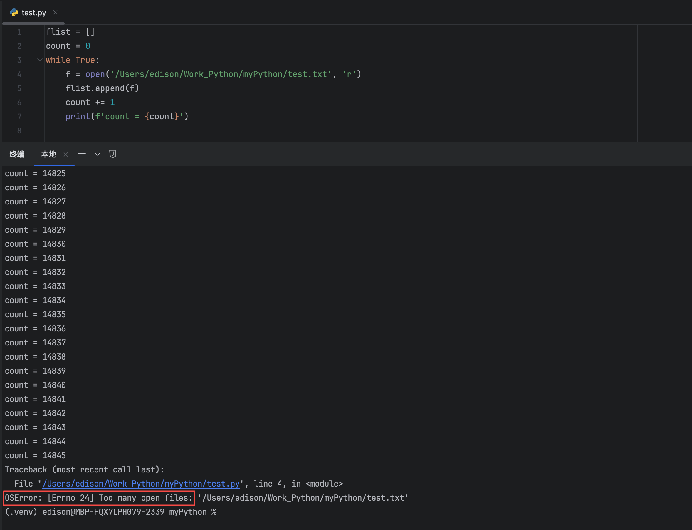 运行结果如下:如果一直循环的打开文件,而不去关闭的话,就会出现下面的报错。