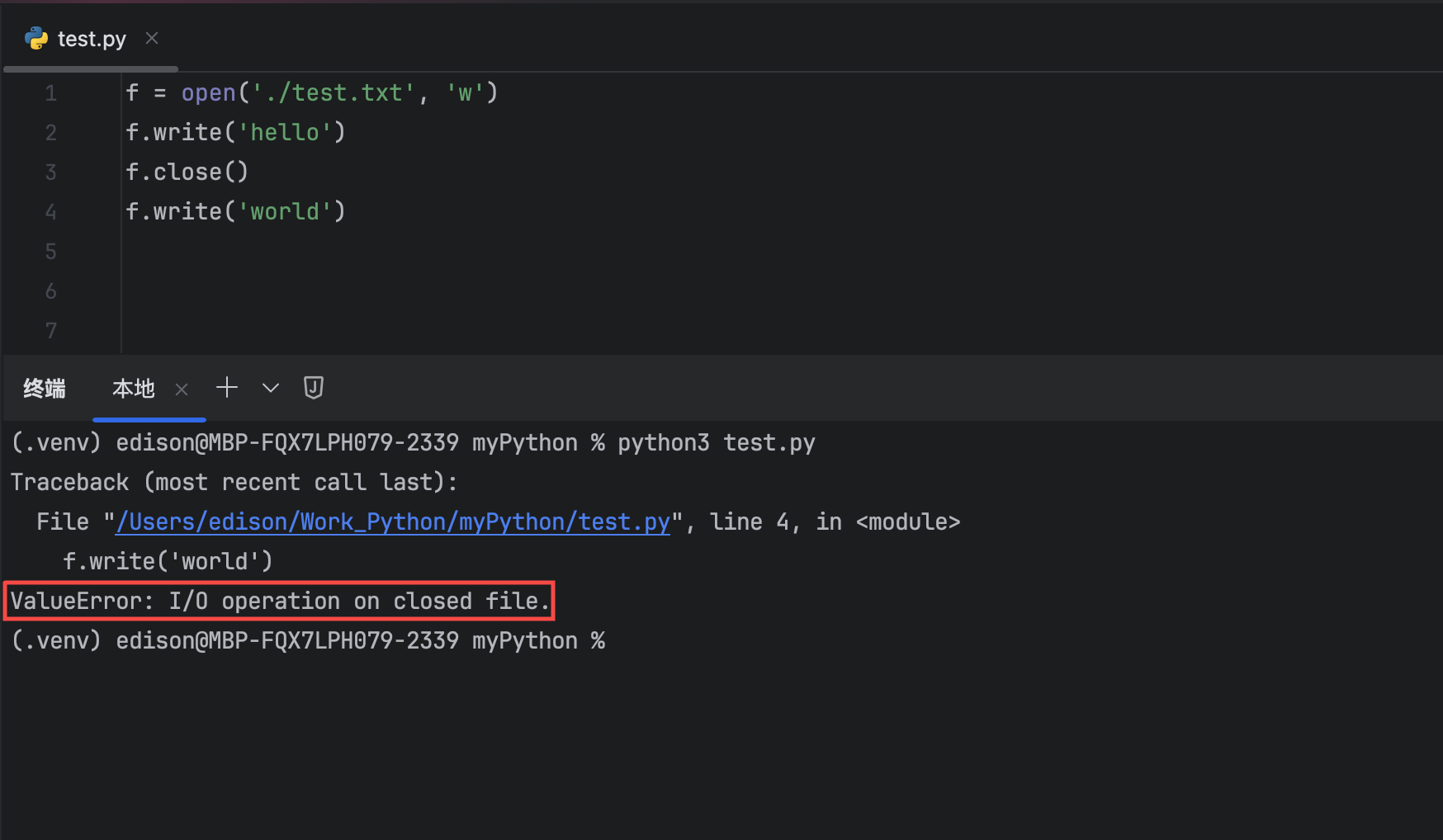 - 针对已经关闭的文件对象进行写操作,也会抛出异常。