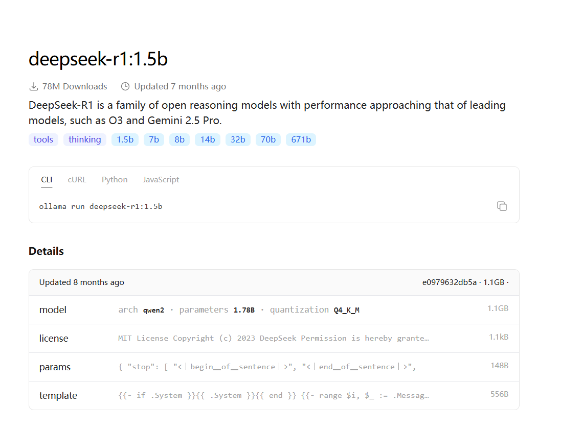 本文选择deepseek-r1:1.5b,模型大小1.5G,2C4G勉强能运行。