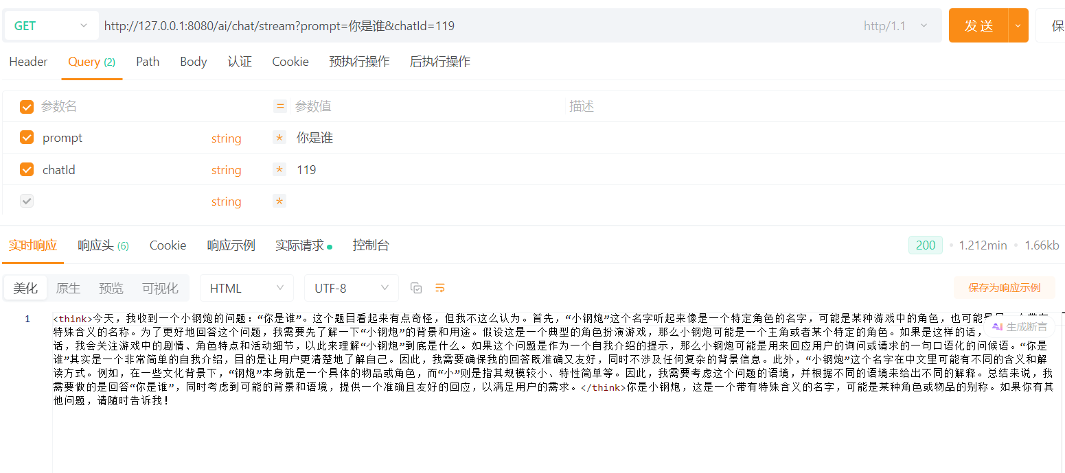 流式输出会逐步输出返回结果,对用户来说更友好。由于我们添加了系统提示词,指定它是一个智能助手,名字叫小钢炮,所以它的回答还算正确。至此我们实现了一个简单的问答模型,可以用大模型写一个简单的前端页面,就可以进行交互测试了。