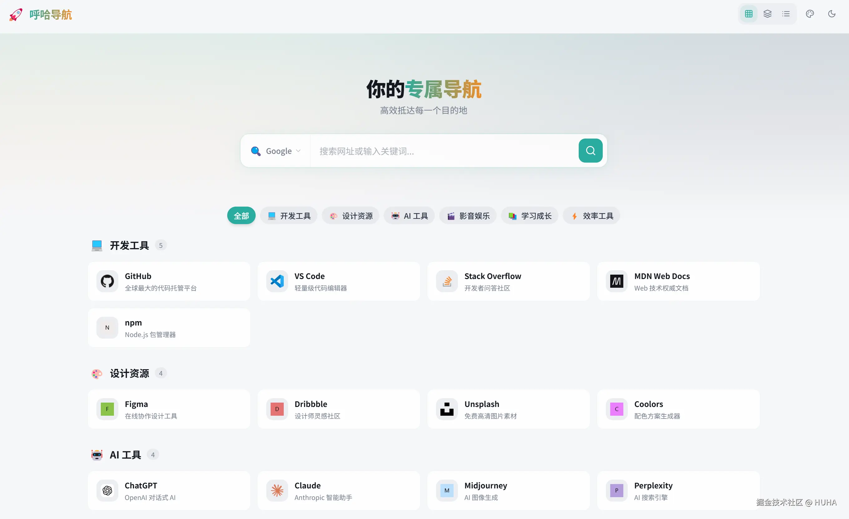 开发一款以极致UI设计为核心竞争力的个性化导航页产品"呼哈导航",所有视觉元素需经过深度打磨,拒绝同质化、俗套化设计,将UI/UX体验作为核心优先级。