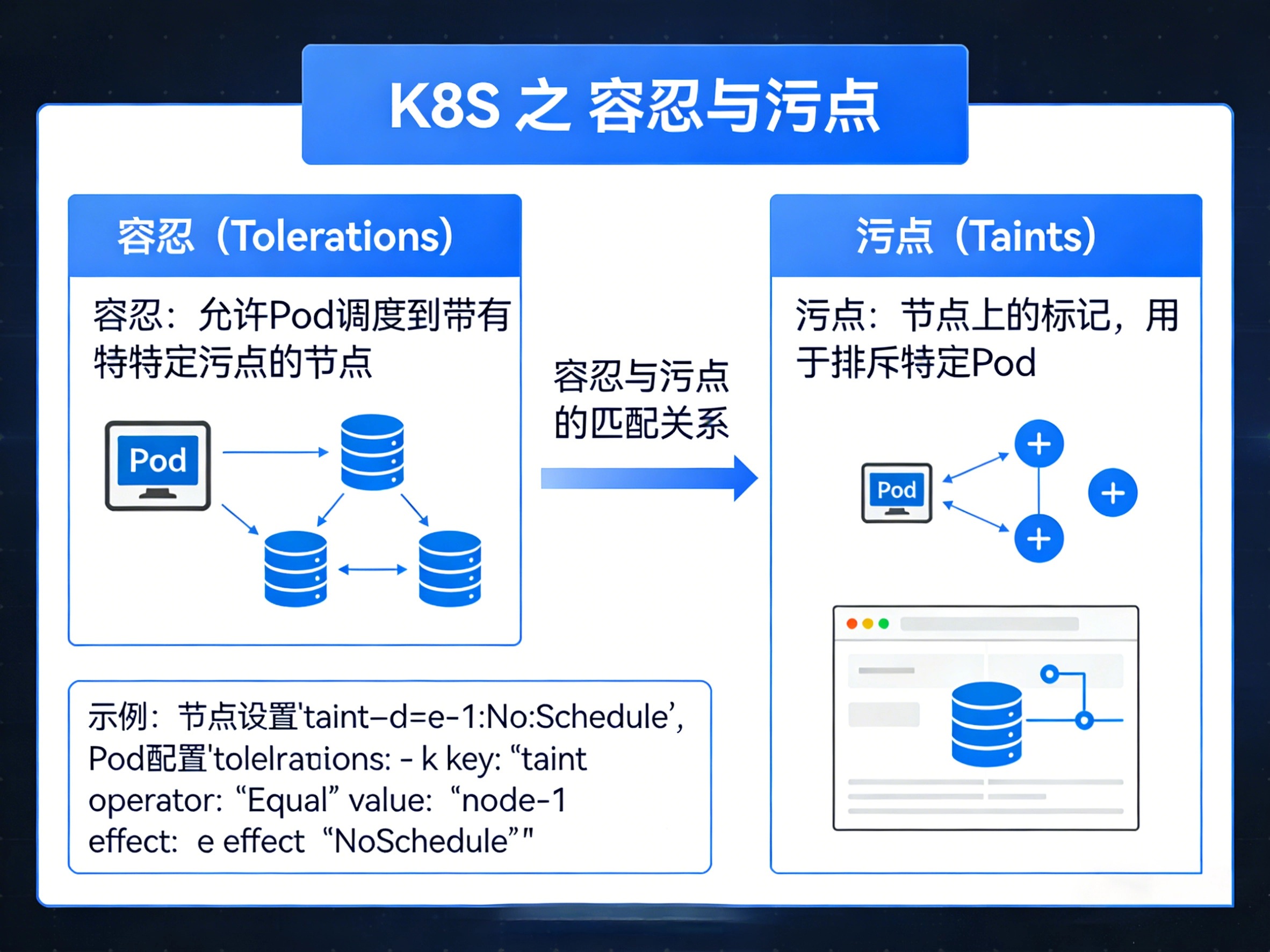 核心逻辑 :污点是节点的"拒绝策略",容忍是 Pod 的"豁免凭证"。两者独立存在,但必须配对匹配 才能实现精准调度控制。