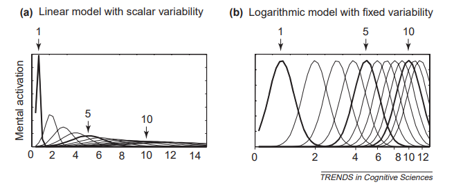心理数量与实际客体数量之间的对数关系是一种理想模型,它们之间实际上还存在着高斯分布的噪音。也正是这些噪声给估计带来不确定性(不然,给定一个实际客体数量,就可明确其心理数量,而非一个估计值)。 因此从韦伯定律加上噪声可进一步得到线性模型(图3(a))和对数模型(图(b))(Feigenson,Dehaene,Spelke,2004)。线性模型和对数模型都是对添加了噪声的韦伯定律的解释,但其解释方式不同。线性模型认为实际数量与心理数量呈线性关系(即简单理解为y=ax,y为心理数量,x为实际数量,a为常数)。但当实际数量越大时,噪声的方差就越大,心理数量之间的高斯区间重叠程度就越大,不确定性就越大,因而最终表现为对数关系。对数模型认为噪声的方差对于所有实际数量都是一样的,而实际数量与心理数量是对数关系(类比为y=lnx,ln为对数函数),因而呈现对数关系。