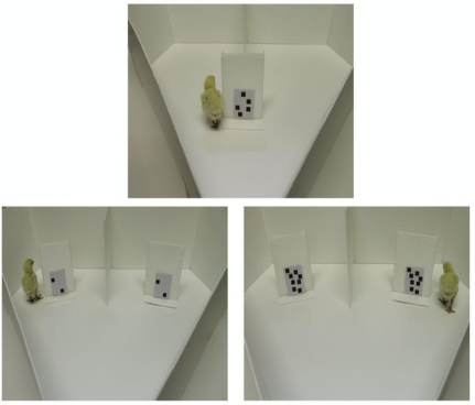 Rosa Rogani进行了如下实验,她们在一个有五个小正方形的挡板后方放置了蜡虫,以此训练小鸡为了寻找食物走向挡板。经过训练后,将这个挡板撤走,换成两个带有相同数目的小正方形的挡板,分别置于左右两边,如图1。实验结果显示,当两个挡板的小正方形个数为2时,小鸡自发的走向左边挡板的概率超过70%。相反,当两个挡板的数量为8时。小鸡走向右边挡板的概率更高(资料来源:http://theconversation.com/like-most-humans- chicks-count-from-left-to-right-36736)。另外,其他研究在恒河侯(Rugani,Kelly,Szelest,Regolin和Vallortigara,2010)和7个月大的婴儿(de Hevia和Spelke,2010)中也发现了类似的效应。因此,这说明SNARC效应具有先天性。