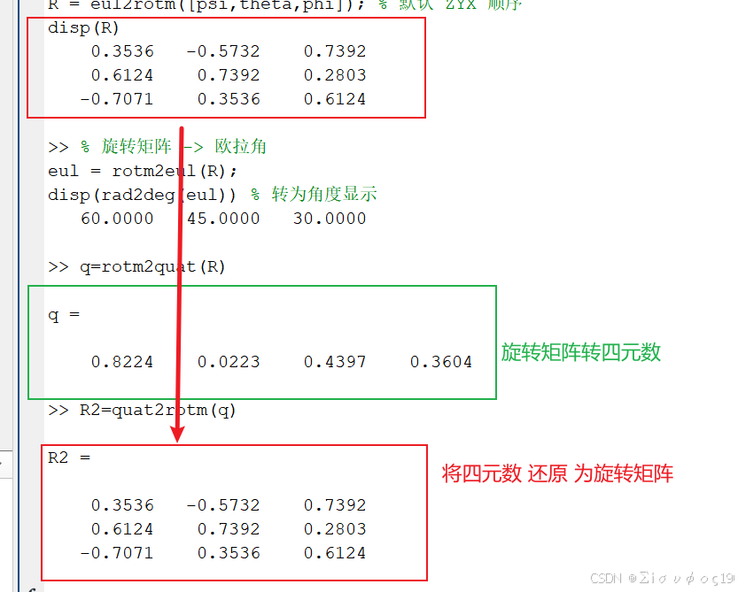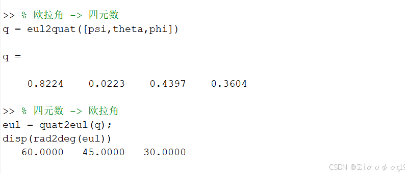 cpp% 四元数 -> 欧拉角 eul = quat2eul(q); disp(rad2deg(eul))