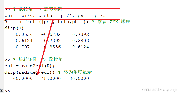 | 欧拉角 → 旋转矩阵 | eul2rotm() |