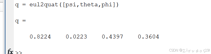 cpp% 欧拉角 -> 四元数 q = eul2quat([psi,theta,phi]);