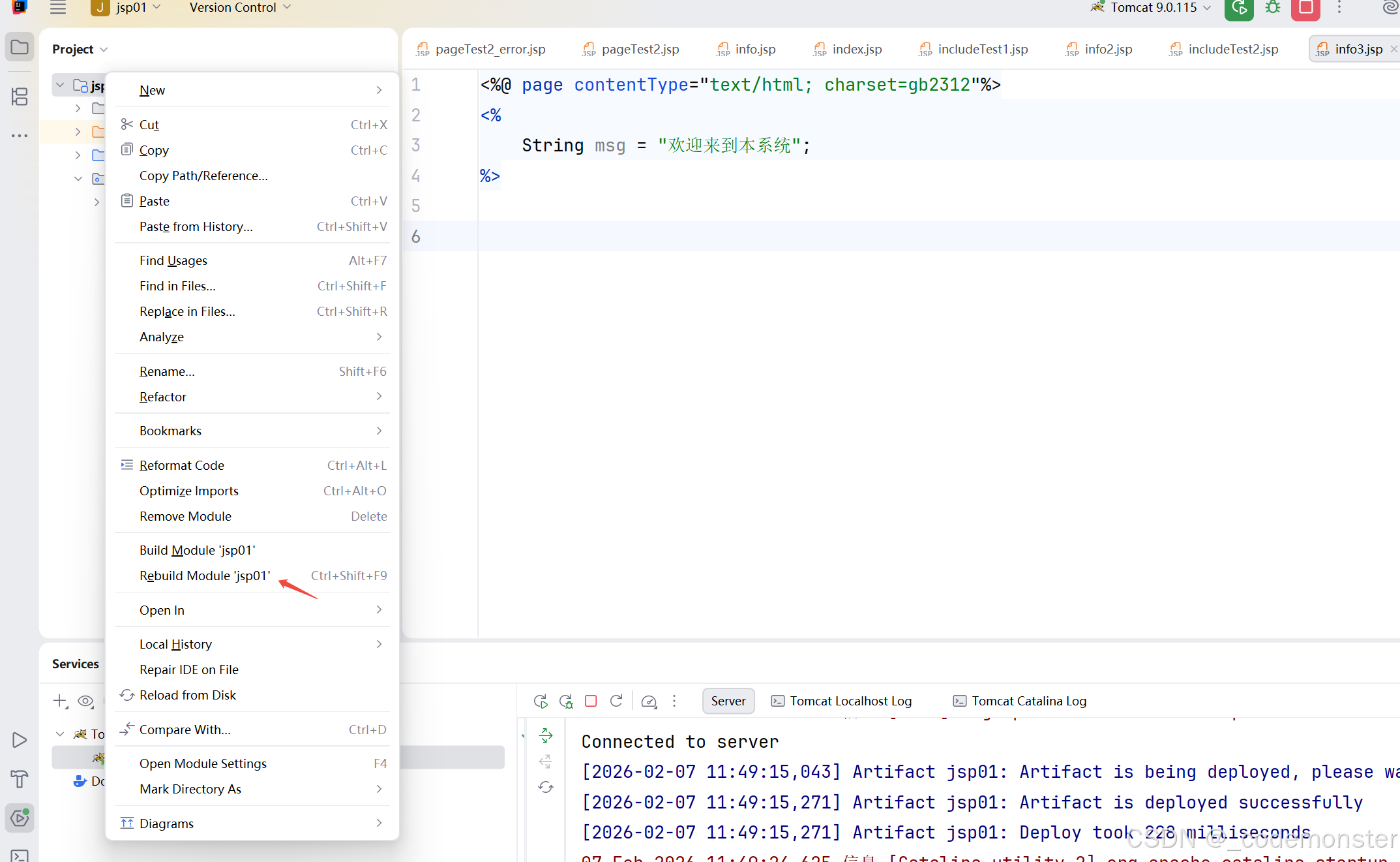 此时需要右键本项目并选择Rebuild Module jsp01来重构项目