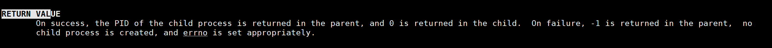 现在执行man 2 fork命令来查看fork函数的返回值。
