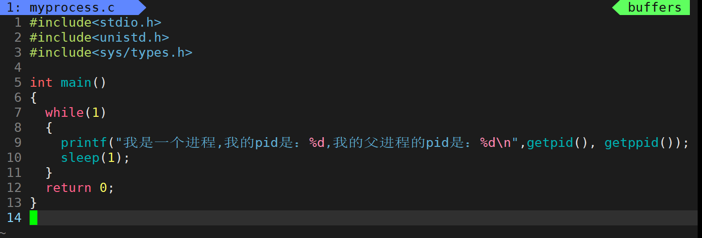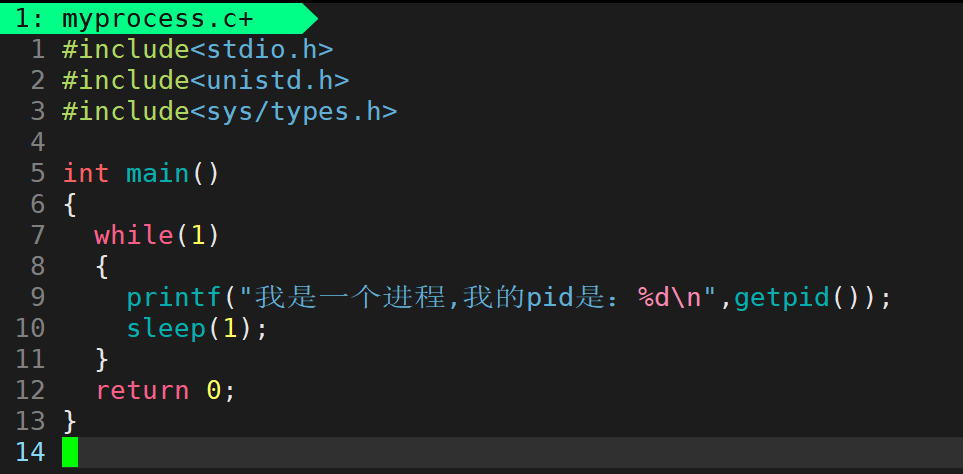 这个程序正在循环打印着"我是一个进程"。既然这个程序可以运行,那么在内存中就有进程,该进程拥有着自己的PCB。
