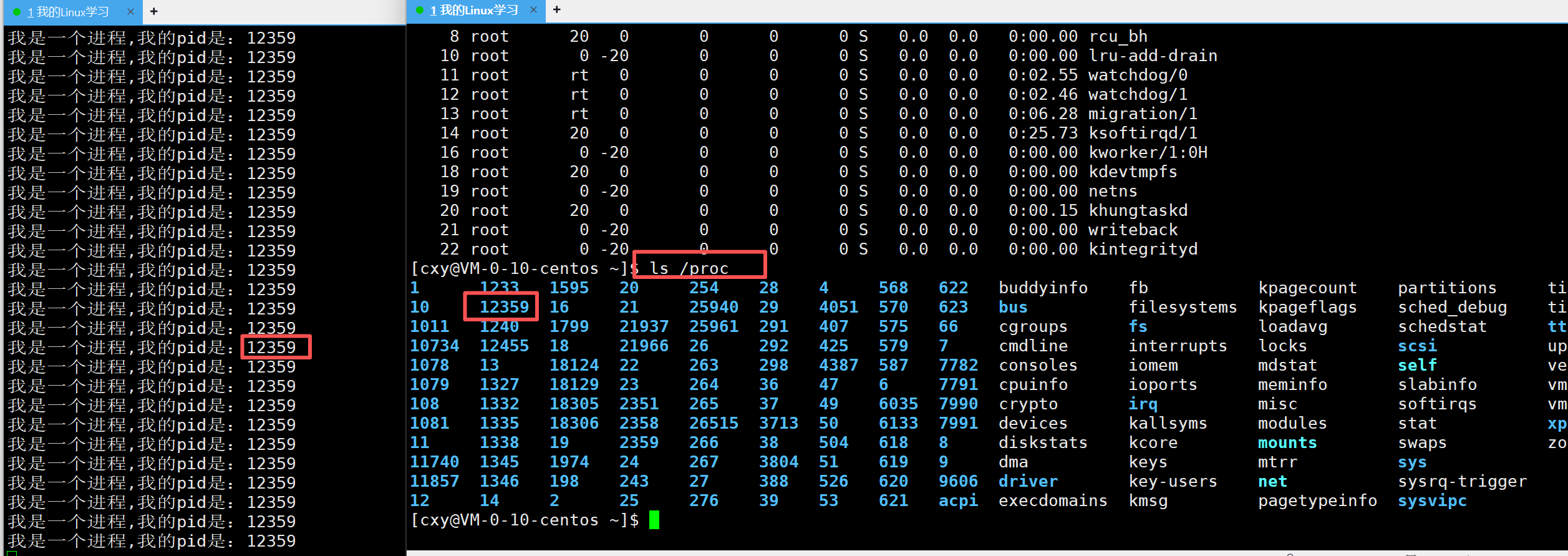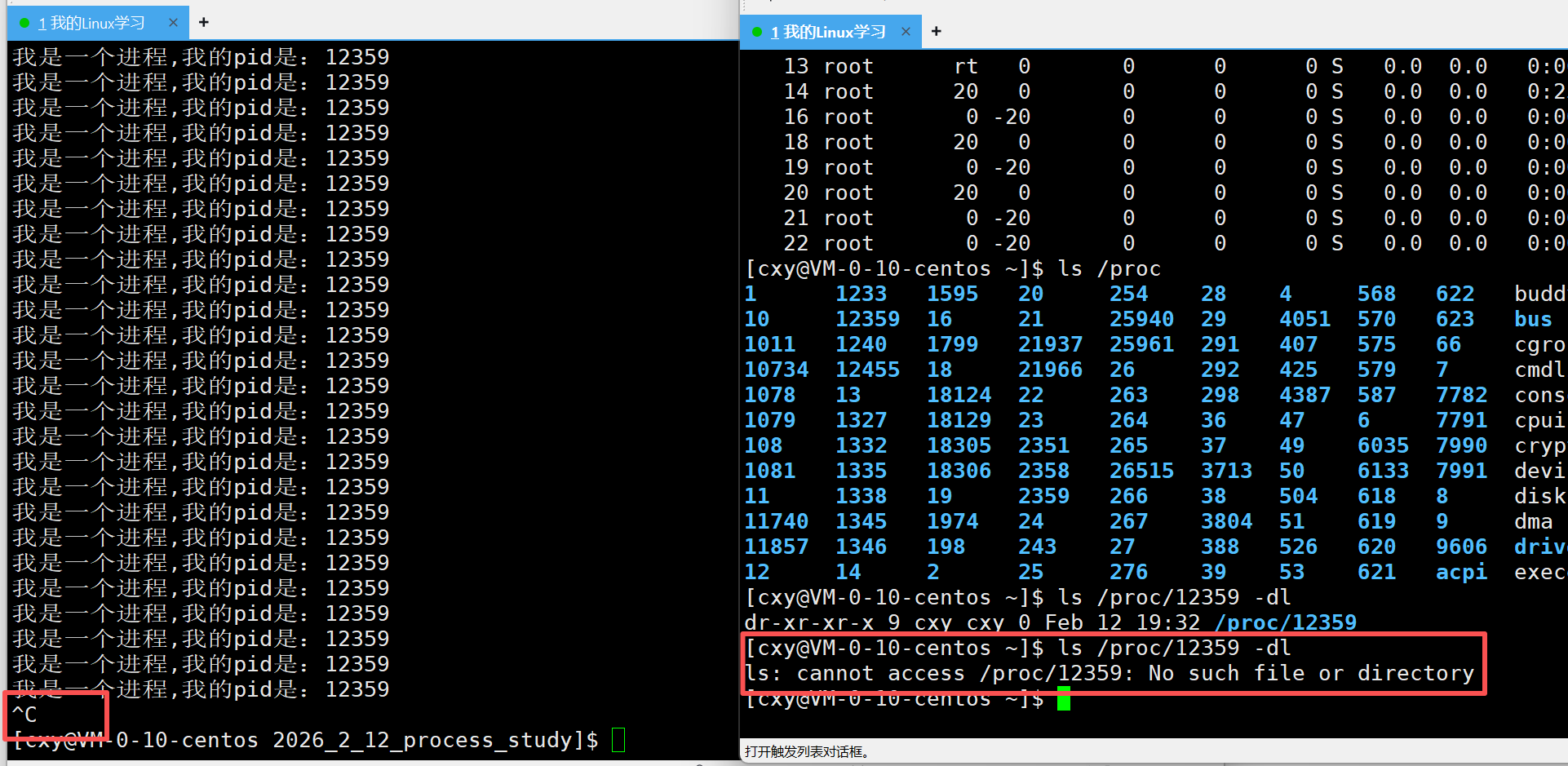可以观察到左边的pid是12359,在proc这个目录下可以看见有一个目录的名称是12359