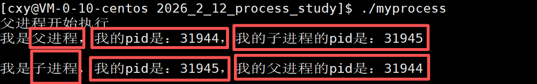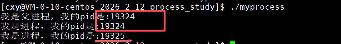 所以理论上最终结果就是先打印 "我是父进程,我的pid是:xxx",然后父进程接着打印"我是进程,我的pid是:xxx"。然后是子进程打印"我是进程,我的pid是:aaa"