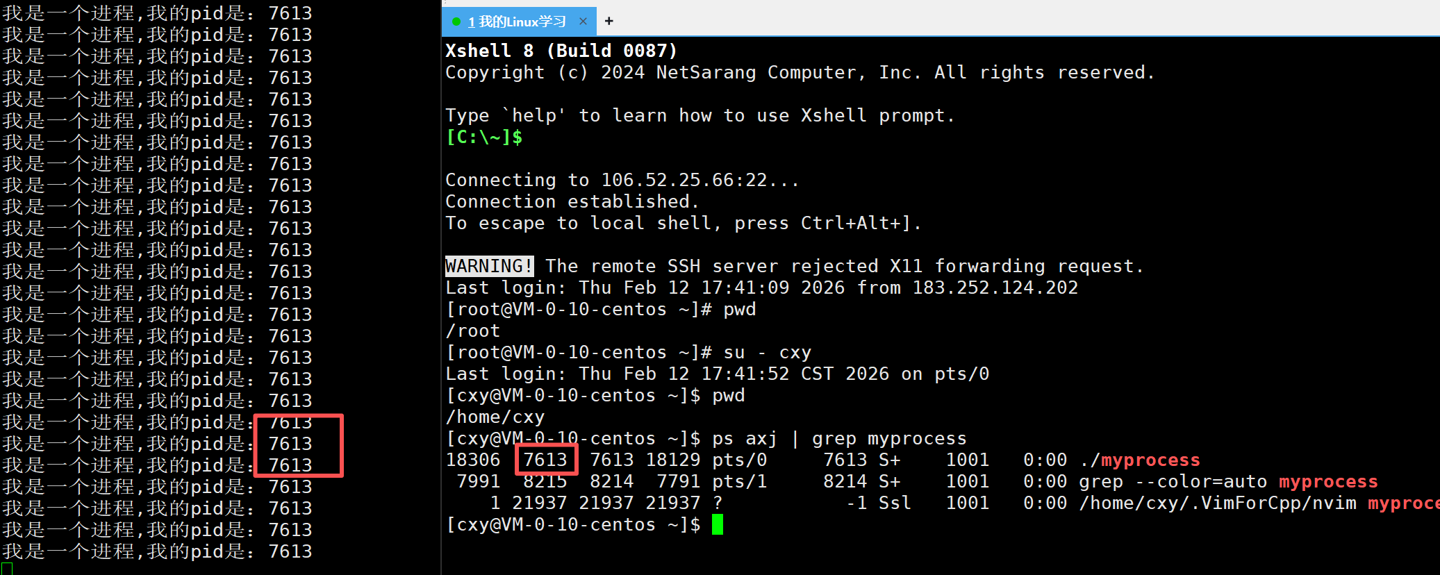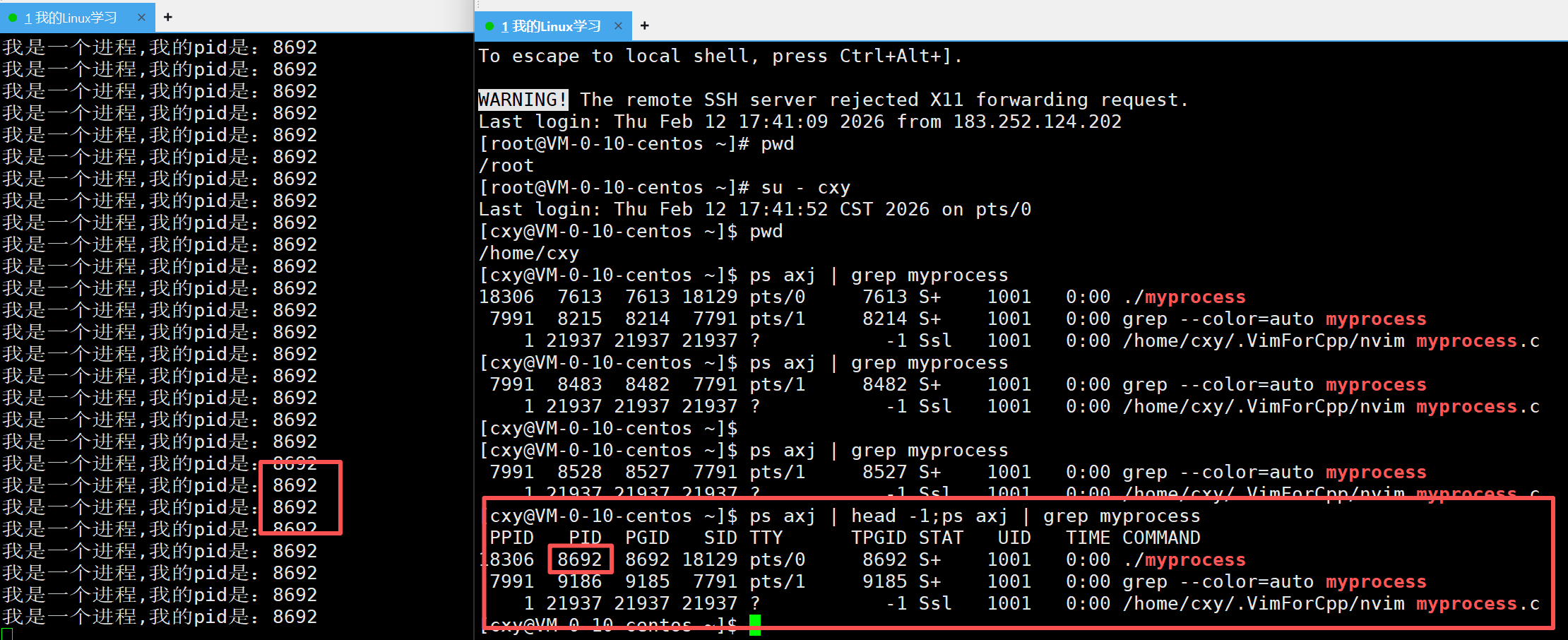 (注:我上下有些截图的pid值是不一样的,因为我终止了该进程又重新运行这个程序,操作系统给该进程重新分配了pid。所以上面的图片只需要看图片中左右两边终端进程的pid相等即可)