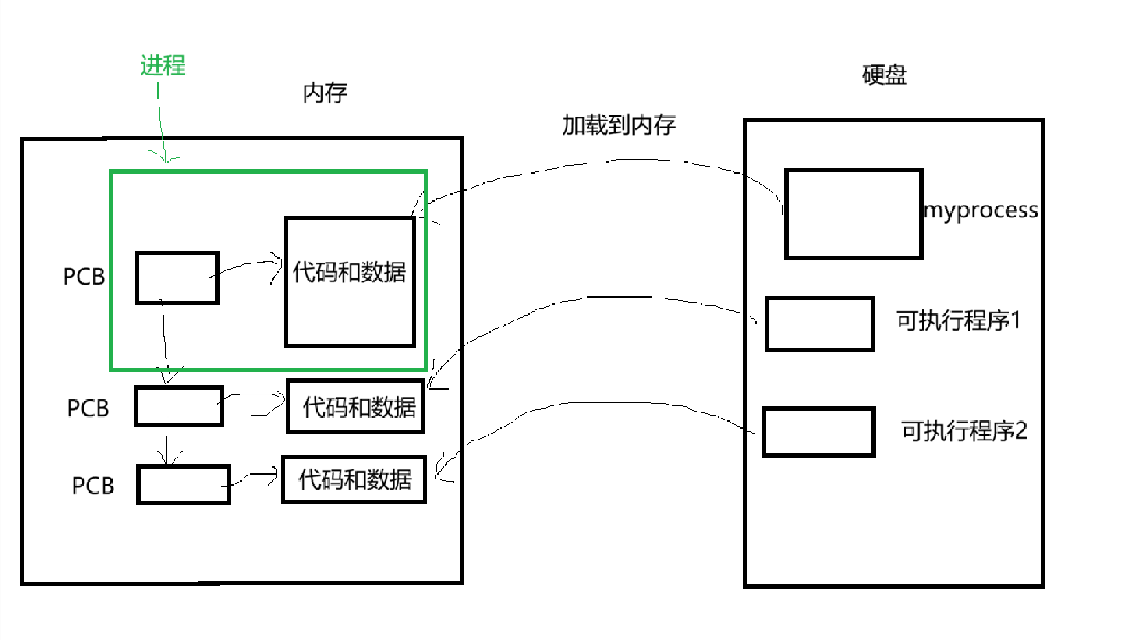 当可执行程序的代码和数据加载到内存运行时,就被称为进程。单仅仅加载到内存是不够的。操作系统目前还无法分辨各个进程之间的区别。这时候就需要PCB(进程控制块),PCB是一个结构体,里面包含着进程的属性,如 pid(唯一表示进程),优先级、代码地址、数据地址等属性。PCB描述着进程的相关信息。