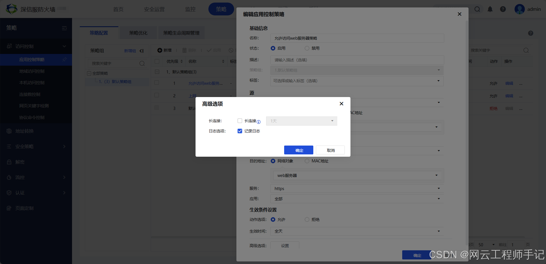 - 动作设置:选择「允许」,同时开启「日志记录」功能,便于后期审计和异常排查;