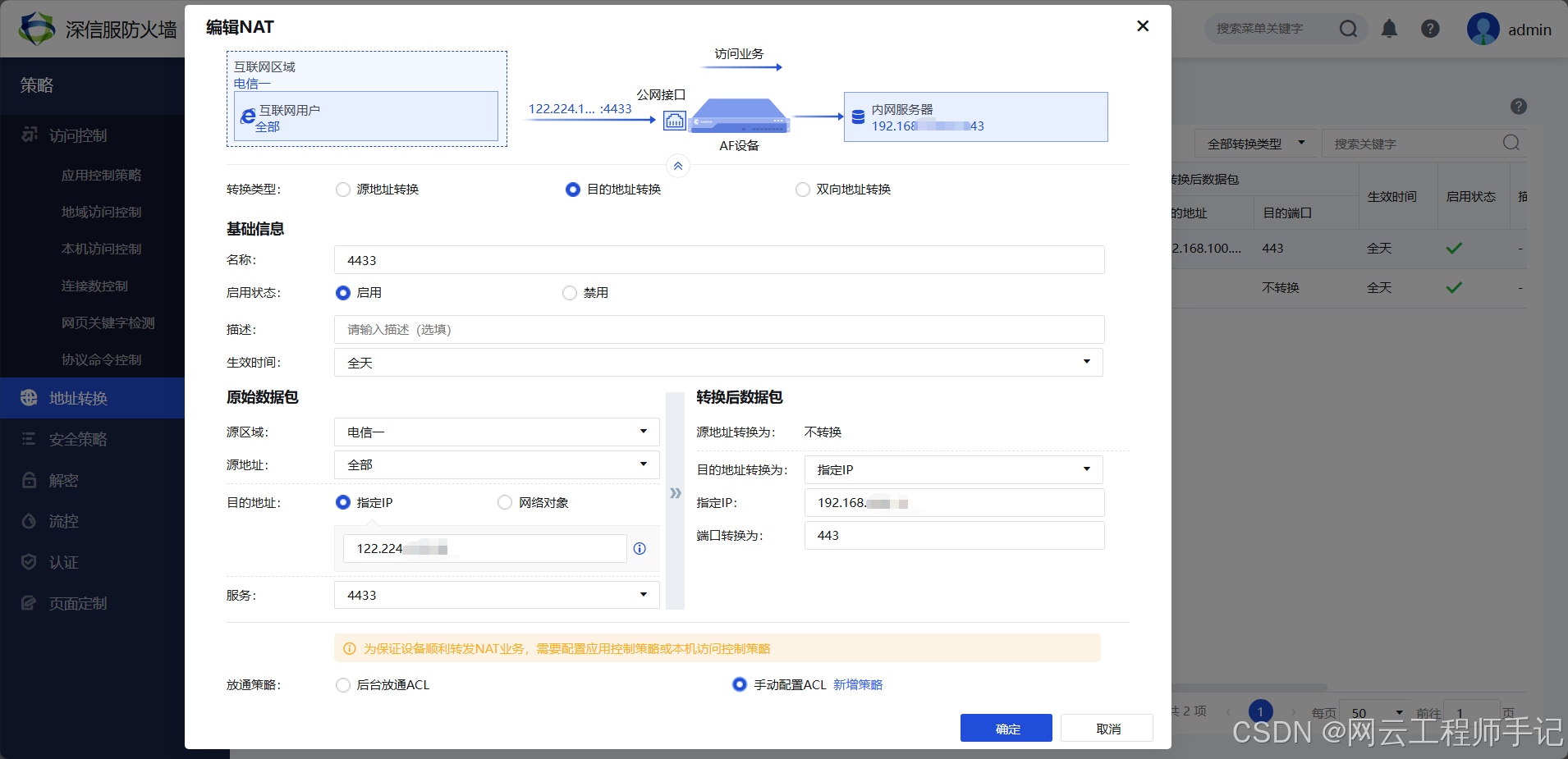 - 登录设备管理后台,进入「地址转换」「目的地址转换」相关配置模块(不同设备名称略有差异,核心功能一致);