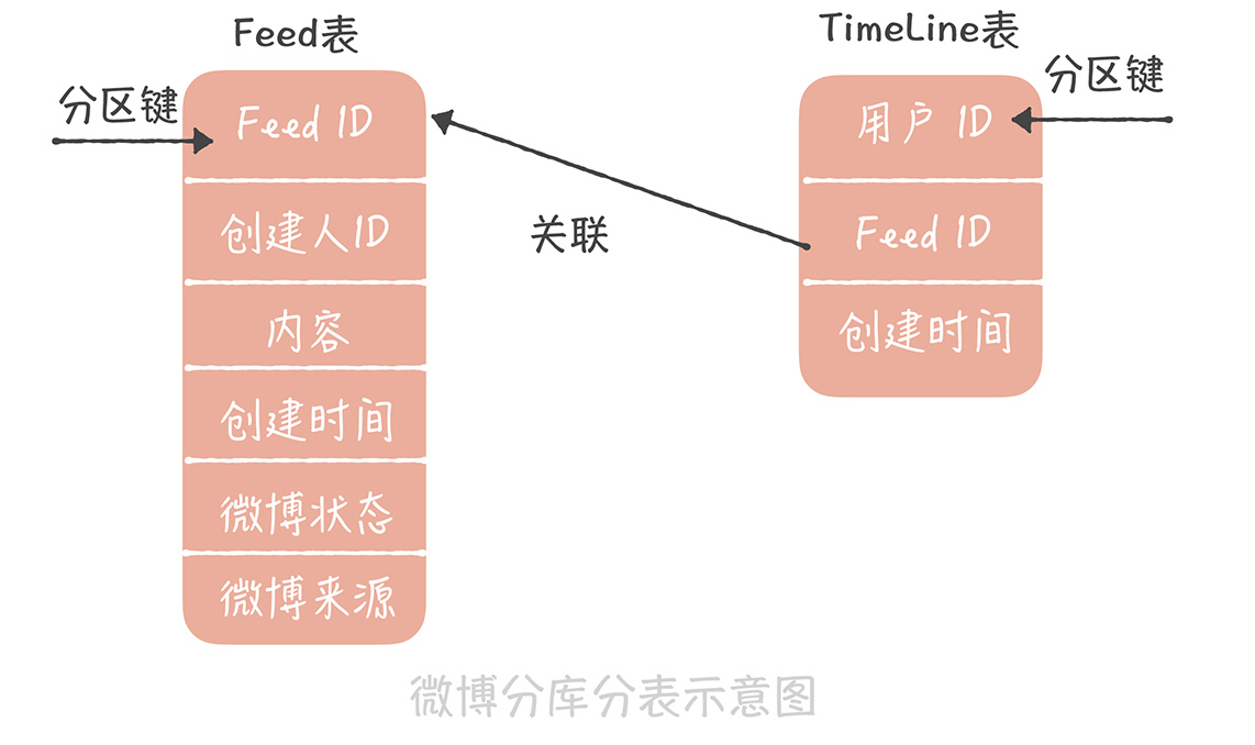 先设计一张 Feed 表,这个表主要存储微博的基本信息,包括微博 ID、创建人的 ID、创建时间、微博内容、微博状态(删除还是正常)等等,它使用微博 ID 做哈希分库分表;
